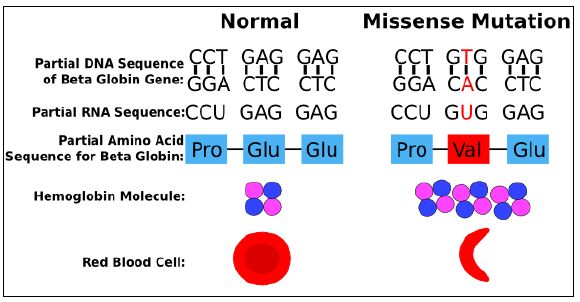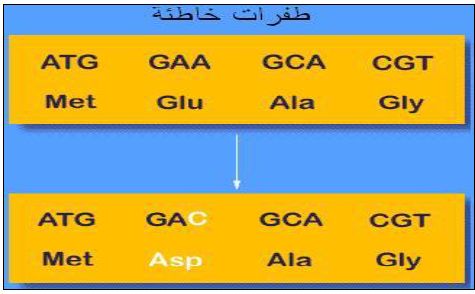 طفرات موضعية او نقطية Point Mutations وغير مترادفة Nonsynonymous اي يحصل تغير في قاعدة نتروجينية واحدة ويؤدي الى تغير الحامض الاميني المشفر له اي انتاج حامض اميني مختلف في البروتين الناتج وبالتالي يدمج حامض اميني غير صحيح يؤدي الى تغير البروتين وجعل البروتين غير فعال ، فالناتج يعتمد على نوعية التغيير في الحامض الاميني وموقعه في البروتين كما موضح في الشكل الاتي: