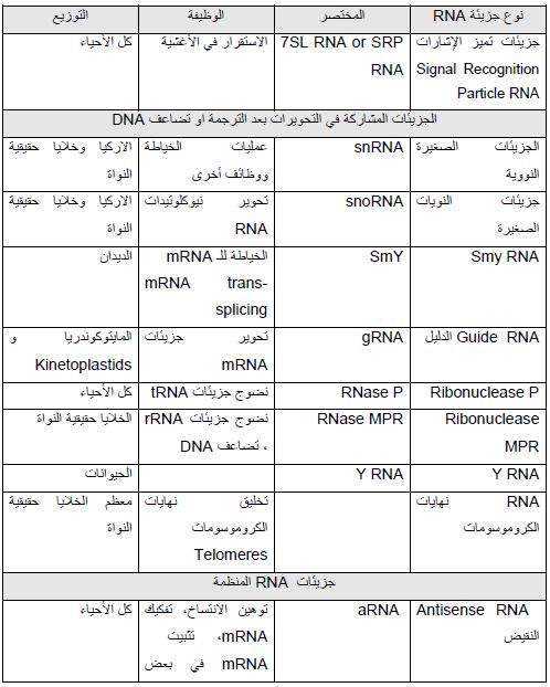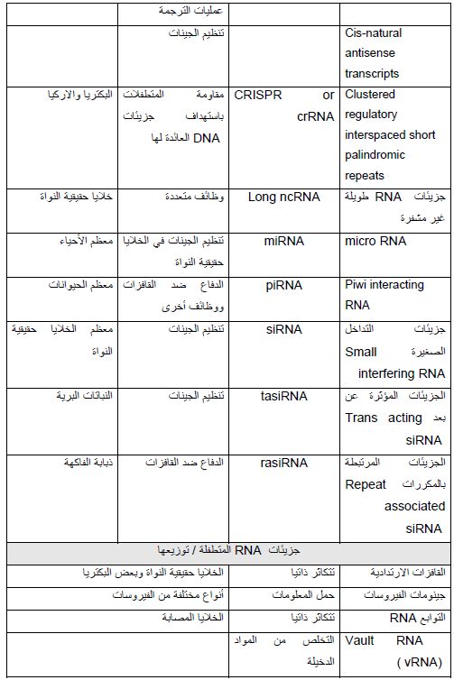 جزيئات معظمها صغيرة ، وإنتاجها او مراحل عملها تخالف القضية المحورية Central Dogma في علم الحياة البايولوجي والتي تشير الى "ان المعلومات الوراثية تنساب من DNA (الجينات) الى الجزيئات الوسطية RNA ثم تترجم الى بروتينات " . ولكن هذه الجزيئات الصغيرة التي يطلق عليها في العموم جزيئات غير مشفرة ncRNA يمكن ان تنتسخ من أجزاء متعددة من الجينوم وليس جينات مــــــــــــــحددة وتقوم بعمليات التنظيم ضمن عملية شاملة يطلق علـــــــــــى بعضها تداخل RNA Interference, RNAi . وبطبيعة نشوءها فهي تشابه كل من rRNA و tRNA التي تتوقف رحلتها بعد الخطوة الأولى من الانتساخ. وقد اكتشف أعداد وأنواع كثيرة منها التي تساهم في تنظيم التعبير الجيني والتي يمكن ان ترتبط بالعديد من البروتينات مثل عائلة Ago Proteins . وفي العموم فان كل ما يتعلق بجزيئات RNA من حيث التركيب والوظيفة واي مواصفات أخرى تندرج تحت دراسة مكنون النسخ Transcriptomics الذي يتعامل بشكل رئيس مع ما يقابله من مكنون النسخ . وهناك العديد من الجزيئات غير المشفرة الأخرى التي تعمل في مجال التنظيم او غيرها من الوظائف التي لم تعرف لحد الآن وتطلق عليها تسميات مختلفة وهي تعد من الجزيئات الفعالة وتطلق عليها تسميات مختلفة مثل Non Coding RNA) npcRNA) او non-messenger RNA) nmRNA) او Small non-coding Messenger RNA snmRNA ، (Small RNA) sRNA وهذه تستعمل عادة مع الجزيئات غير المشفرة الموجودة في البكتريا والجدول التالي يوضح بعض المعلومات عنها :