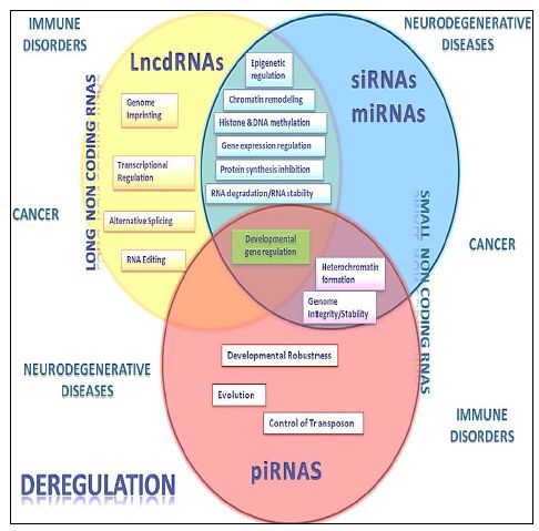 - عدم توازن الجزيئات غير المشفرة من حيث المحتوى او حدوث تغيرات فيها نتيجة الطفرات يؤدي الى حدوث عدد من الأمراض مثل متلازمة Prader-Willi التي تتصف بنهم للأكل وقلة في التعلم وكذلك تساعد في ظاهرة التوحد Autism والزهايمر وفقدان السمع وغيرها.