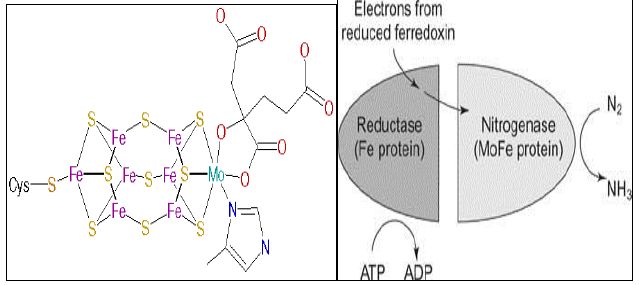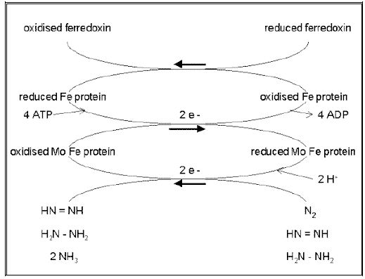 نظام (EC 1.18.6.1EC 1.19.6.1) يتكون من شقين رئيسة تقوم باختزال النتروجين من التكافؤ صفر إلى - 3 كما في الأمونيا والذي يشابه درجة الاختزال للنتروجين الموجود في الأنظمة الحيوية ، وتتم عملية الاختزال تحت ظروف لاهوائية ويتم تثبيته أما بشكل تعايشي بين بكتريا Rhizobia وجذور البقوليات أو بين جذور العائلة النجيلية وبعض البكتريات الأخرى، أو يتم تثبيته بواسطة الأحياء البدائية النواة الأخرى بشكل حر، ويتكون النظام من التراكيب التي يمكن أن تقوم بأختزال مركبات أخرى، وأهم المكونات التي يختزل عندها النتروجين هوالموليبدنم Molybdenum الموجود ضمن تركيب خاص يسمى Molybdenum Cofactor وتحتاج العملية الى صرف كميات كبيرة من الطاقة بشكل ATP والتركيب موضح في الشكل الآتي :