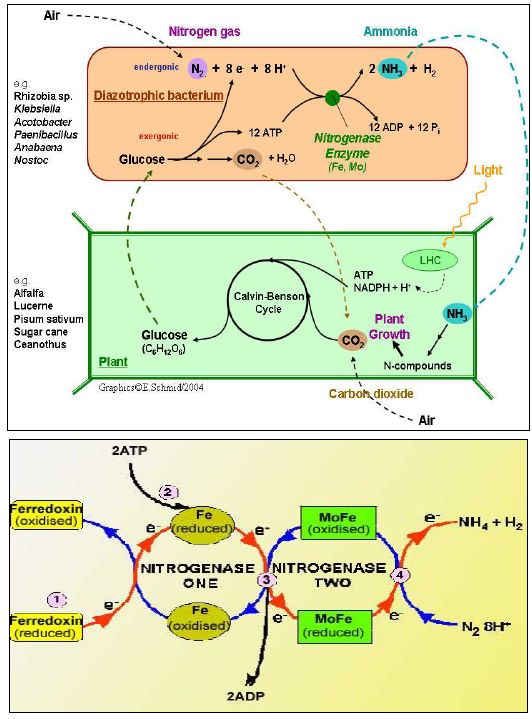 ويتم تثبيت النتروجين بواسطة النظام الانزيمي Nitrogenase الذي يعمل بظروف لا هوائية وذلك لأن النظام حساس للأوكسجين لذلك تتخذ الخلايا مختلف الوسائل لحمايته.