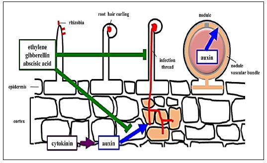 عملية تكوين العقد الجذرية لنباتات البقوليات وغيرها نتيجة غزو بكتريا Rhizobium المثبتة للنتروجين وتكون العملية متخصصة جداً يشترك فيها الطرفان.