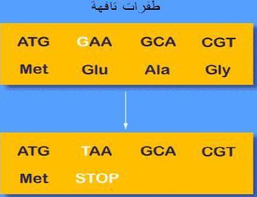 طفرات نقطية في توالي DNA تحدث بحيث تتغير الشفرة الوراثية للحوامض الامينية الى شفرة وقف تؤدي الى إنهاء عملية الترجمة مما يؤدي الى تقصير طول السلسلة الببتيدية الناتجة من الجين كما موضح في الشكل