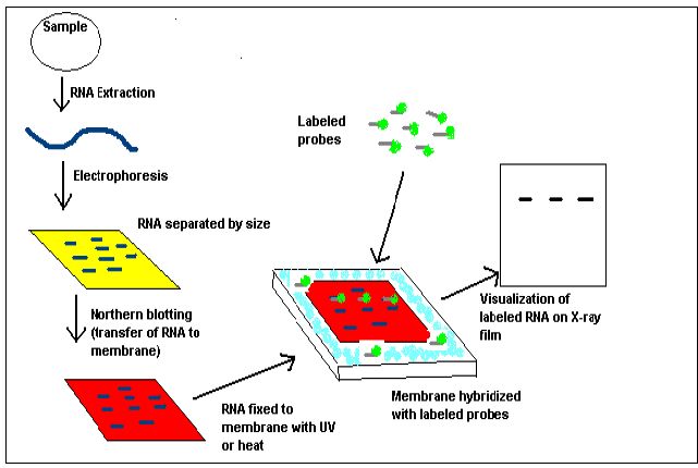 ويتم الفصل عادة بوجود معاملة ضابطة تحوي على قطع من RNA معروفة الحجم ( RNA Ladder) . ثم تنقل جزيئات RNA إلى أغشية خاصة وأفضلها أغشية نايلون موجبة الشحنة لتسهيل ارتباط جزيئات RNA السالبة الشحنة ، ثم تثبت على الأغشية بالمعاملة بالأشعة فوق البنفسجية او الحرارة ، وتغسل الأغشية لإزالة الفائض من الجزيئات ، ثم يتم تهجينها مع جزيئات معلمة بالفسفور المشع p32 او مقرونة بإنزيمات الإعلان وهي Alkaline Phosphatase او Horseradish Peroxidase . والمجسات المستعملة RNA Probes تكون حاوية على توالي محدد مكمل لبعض تواليات القطع المراد الكشف عنها ، واقل عدد من هذه التواليات يكون بحدود 25 قاعدة لانها يمكن ان تقاوم عمل التجربة . ثم يتم الكشف عنها اما باستعمال أفلام الأشعة السينية في حالة استعمال المواد المشعة ، او التقدير اللوني في حالة الإنزيمات او أي طريقة أخرى تلاؤم عملية التوسيم التي تمت على المجسات .