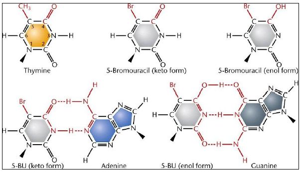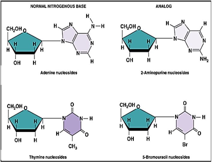 مركبات تؤدي الى تطفير DNA نظرا لتشابهها مع قواعده وتستطيع ان تندمج بالأشرطة أثناء تضاعفها. فالمادة (5-Bromodeoxyuridine (BrdU تشابه الثايمين وتحوي على ذرة بروم بدلا من مجموعة المثيل في الموقع 5 وبذا تستطيع ان تندمج أثناء التضاعف ، ووجود ذرة البروم يكون غير ملائما في DNA ويؤدي الى اضطراب تكامل القواعد وبالتالي الخطأ في ازدواجها .
