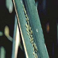 في حالة المن الأخضر على القمح تظهر بقع حمراء ذات مراكز سوداء على نصل الأوراق القريبة من سطح الأرض ثم يحدث تدمير للمادة الخضراء وتموت الأوراق المصابة وفى حالة الإصابة بحشرات من الشوفان يلاحظ وجود إفرازات عسلية وتجمع للعفن الأسود على الأوراق والأغماد المصابة ونقص امتلاء الحبوب وتقزم للنباتات شديدة الإصابة.