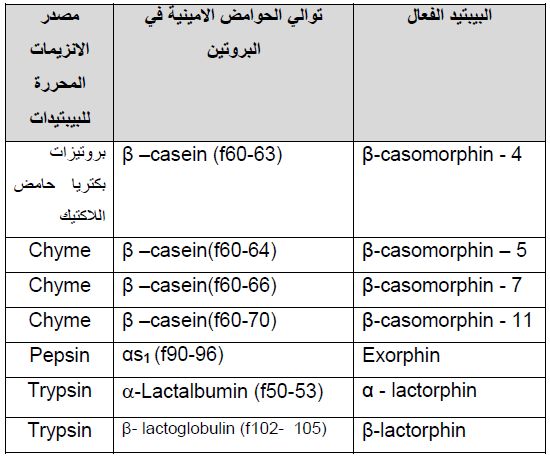وتتصف الببتيدات المخدرة بتركيبها الخاص الذي يسمح لها بالتداخل مع المستلمات خاصة النوع μ على سطوح الخلايا ، ويوجد التايروسين في النهاية الامينية تليها ثمالة برولين ثم حامض اميني حلقي اخر وعادة يكون التايروسين او الفنيل النين في الموقع الثالث او الرابع . وإزالة ثمالة التايروسين تؤدي الى فقدان الببتيد فعاليته ، اما وجود البرولين فيعد مهما للمحافظة على الترتيب الملائم للحوامض الامينية الحلقية . وتتآزر فعالية البيبتيدات فيما بينها وكذلك مع المواد غير البيبتيدية مثل الدهون والدهون السكرية والسكريات قليلة التعدد . ولذلك يفضل استعمالها بشكل خليط كما في المنتجات المتخمرة التي تكون بروتيناتها محللة بشكل كبير . اما الجرع الزائدة منها فيمكن ان تكون مضرة بالجسم والبعض منها موضحة في الجدول الاتي :