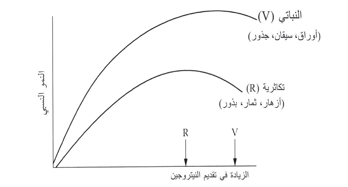 النمو النسبي للنباتات في الاستجابة للتسميد بالنيتروجين. الخطوط المستقيمة تشير إلى المستويات النسبية للتسميد المرتبطة بانخفاض النمو الإنجابي (R) والنمو النباتي (V).