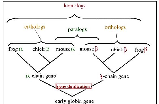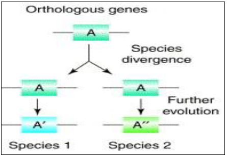 الجينات الموجودة في انواع مختلفة انحدرت من جين جد واحد اثناء تكوين الانواع Speciation عند انفراج الاحياء الى انواع ، وهي احد انواع Homologous Genes وهذا يعني انها تنتقل عموديا ، وعادة تكون لها الوظيفة نفسها وقد تكون الجينات غير متماثلة ولكن الوظائف متشابهة ولكن غير متماثلة كما في الشكل :