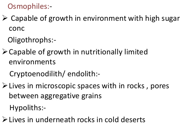 أحياء تتحمل ضغوط تنافذية عالية سواء كانت ناتجة من وجود الأملاح أو السكريات وتستطيع النمو في الأوساط المركزة ، وتشمل أنواع مختلفة من الأحياء المجهرية مثل البكتريا والخمائر والفطريات والطحالب ، اذ أن معظمها يمكن أن يعيش بنشاط مائي يصل إلى 0.61 وتعتمد هذه الأنواع من الأحياء على تجميع الكحولات المتعددة التي هي مركبات محبة للماء وبذلك تزيد من تركيز الماء داخل الخلايا وتقلل فرق الضغط عبر الأغشية الخلوية Compatible Solutes وتختلف الأحياء في نوعية المذابات التي تجمعها فمثلاً الخميرة Saccharomyces rouxii تجمع الارابيتنول Arabinitol ليصل إلى 18.5 % من وزن ا لخلايا واخرى تجمع الكليسرول ، ويستفاد منها في إنتاج الكليسرول وغيره من الكحولات المتعددة.