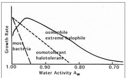 والاحياء المتحملة للضغوط التنافذية تعيش في مدى من جهود الماء والتي تقسم إلى حدود دنيا ومثلى وعليا، والشكل التالي يوضح تصرف الخلايا ونموها مقارنة بالأحياء الحساسة للضغوط التنافذية والأخرى المحبة للضغوط التنافذية.