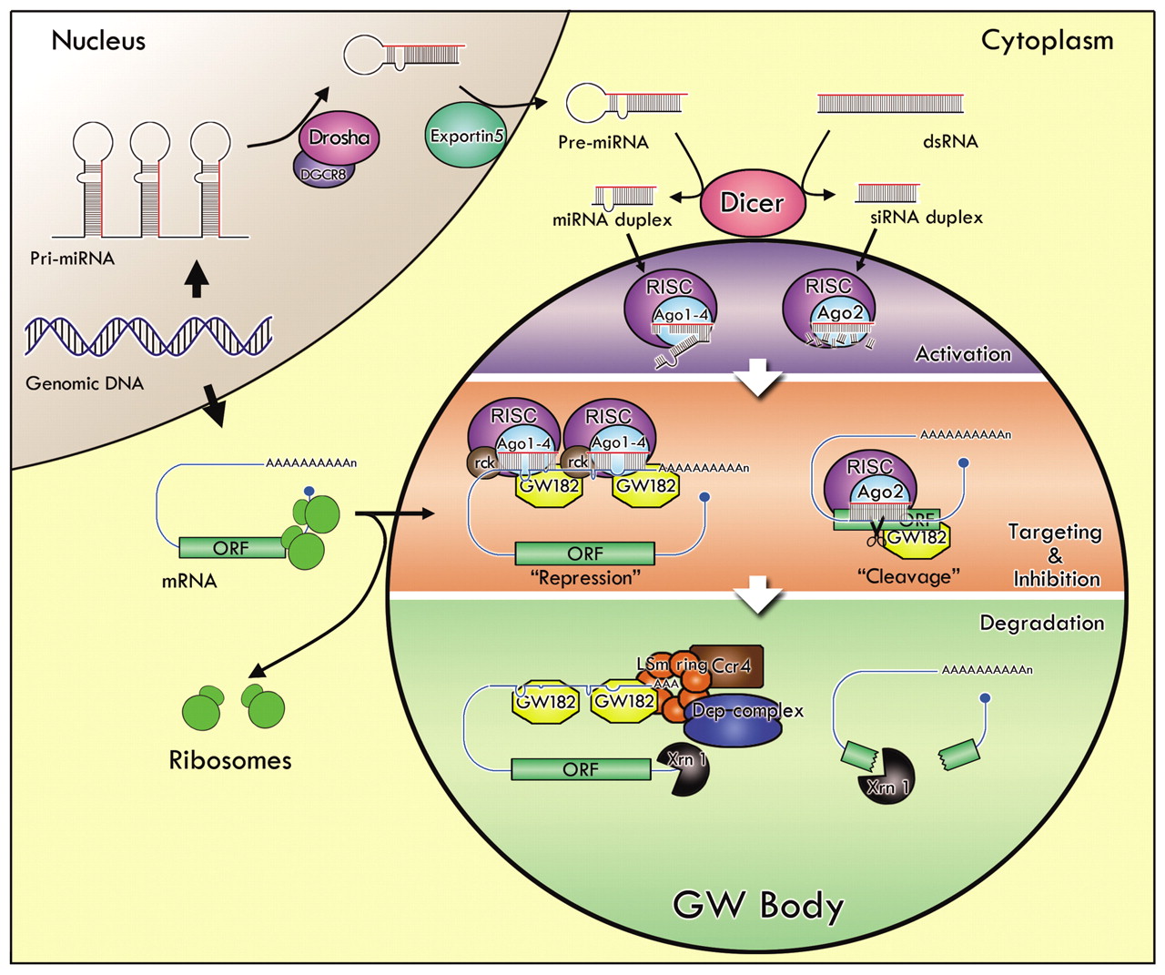 احد مكونات الخلايا حقيقية النواة يوجد في السايتوبلازم تسمى Processing Bodies وله مسميات اخرى ، يحوي العديد من الانزيمات المسئولة عن تفكيك وانقلاب mRNA توجد في الفقريات واللافقريات والنباتات والخمائر . وهي بمثابة اجسام محاطة باغشية مسئولة عن تفكيك mRNA التي تبدأ بازالة Cap ثم ازالة متعددات الادنين Deadenylation أي انها تسيطر على عملية الترجمة بحجزها جزيئات mRNA من مكائن الترجمة . وتعمل ايضا في عمليات اسكات الجينات التي يتوسطها RNA مثل اشتراك siRNA و miRNA .