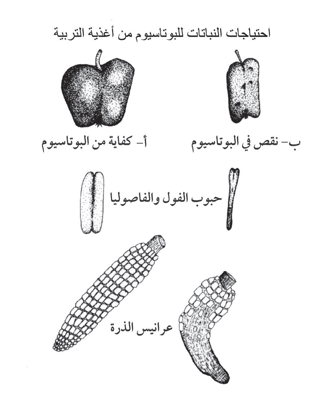 يعبر هذا الشكل عن تأثير نقص البوتاسيوم في الفاكهة والبذور مُظهراً الفاكهة التالفة (التفاح)، والحبوب غير الممتلئة (القمح)، وعرانيس الذرة الفارغة.