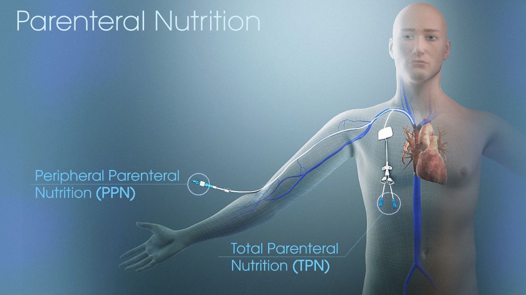 تغذية وادخال المواد بالحقن وليس عن طريق الفم او القناة الهضمية مثل الاعطاء بالوريد او داخل العضلة او تحت الجلد وفي جميع الاحوال تكون خارج الامعاء او القناة الهضمية ويجب ان تكون المواد معقمة . وفيها يزود الجسم بالكربوهيدرات والبروتينات والدهون والالكتروليتات والفيتامينات والاملاح اللازمة لبناء الانسجة والتزويد بالطاقة وغيرها من الفعاليات الفسلجية . تستعمل في حالات الاسعاف وسوء التغذية والحالات المرضية ، وعادة تكون لوقت قصير ويمكن استعمال الادوية ضمن المحاليل الغذائية التي يجب ان تكون مصممة بشكل ملائم .