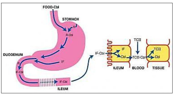 احد انواع فقر الـــــــدم Megaloblastic Anemia تحصل نتيجة فقدان Gastric Parietal Cells المسئولة عــــــن انتاج ( Intrinsic Factor (IF المسئول عن امتصاص فيتامين B12 ،لها اعراض مختلفة ومتشعبة ، وفيتامين B 12 لا يخلق في الجسم وانما ياتي مع الغذاء ويرتبط الى البروتينات ويفك بحموضة المعدة ويعاد امتصاصه في Ileum ويرتبط الى IF .