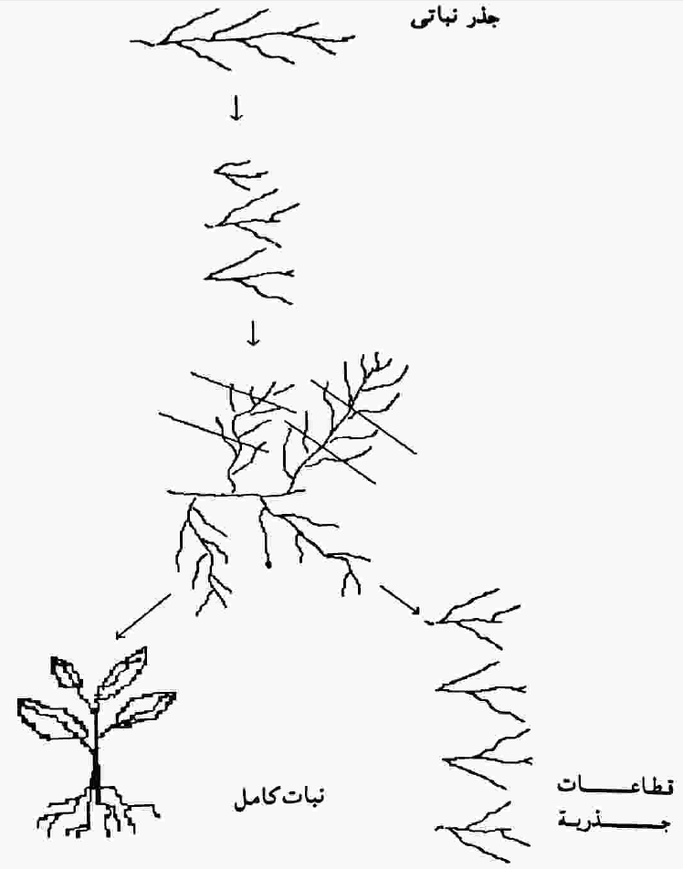 رسم توضيحي لبيان خطوات زراعة الجذور علي بيئة مغذية بهدف انتاج أعداد كبيره من القطاعات الجذرية للتجارب البحثية أو انتاج نباتات كامله بتشجيع النمو الخضري علي الجذور المنزرعة.