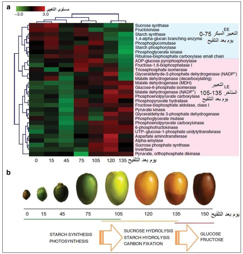 اما دراسة مكنون النسخ Transcriptome والمكنون البروتيني Proteome على مراحل مختلفة من نضج التمور واعتمادا على قواعد البيانات المهمة في هذا المجال مثل KEGG فقد اشارت الدراسات الى ان هناك عمليات تنظيم خاصة بايض الكربوهيدرات وفق مرحلة النضج ، اذ تنشط العمليات الى اقصى مستوياتها بعد 120- 135 يوم من التلقيح ، ويصل الفركتوز اعلى مستوياته مما يعطي التمور الطعم الحلو ، ومن آليات التنظيم مثل انشاط النزيم الانقلاب Invertase الذي ينشط في المراحل النهائية لفلق السكروز الى فركتوز وكلوكوز كما يتضح في الشكل الاتي :