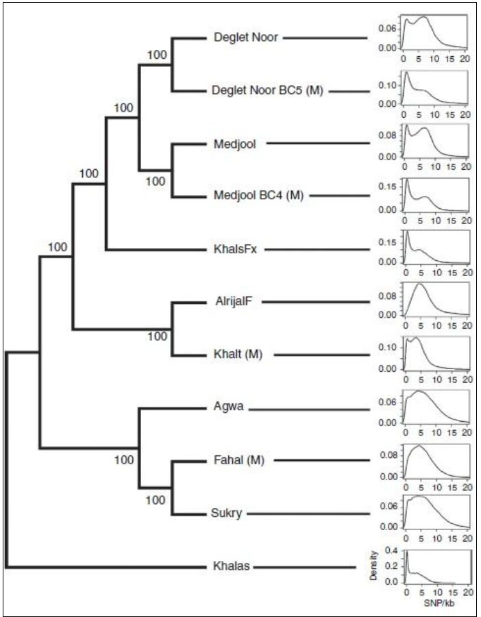 وتحوي الضروب المختلفة من النخيل على SNPs التي تمليها الظروف البيئية والتي تختلف بين الضروي المستزرعة او المدجنة والضروب الصحراوية كما يتضح من العلاقات التطورية بين الضروب المختلفة كما في الشكل الاتي :