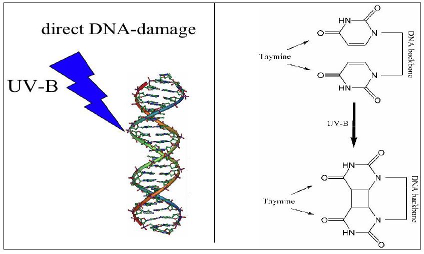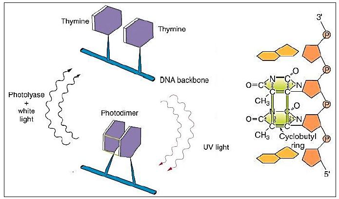 لذلك يجب أخذ الحيطة والحذر عند إجراء عمليات تطوير السلالات الصناعية باستعمال الأشعة فوق البنفسجية كعامل مطفر وحماية الطفرات الناتجة من الضوء بعد عملية التطفير مباشرة إلى أن يتم التعبير عن الطفرة. ويقوم بالتفاعل الاتي :