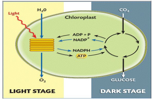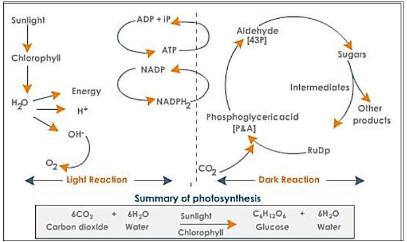 وتقسم التفاعلات التي تشملها عمليات التخليق الضوئي نوعين من التفاعلات، الأولى التفاعلات الضوئية والتي قد تشمل أكثر من نظام للتفاعل وتحصل في أغشية البلاستيدات أو Thylakoid في الطحالب وتؤدي إلى إنتاج pmf وATP خلال تفاعلات كيماوية ضوئية Photochemical،أما المرحلة الثانية فتشمل تفاعلات الظلام التي لا تعتمد على الضوء حيث تستفاد من مركبات الطاقة التي انتجت من المرحلة الأولى لتثبيت ثنائي أوكسيد الكربون اللاعضوي إلى مركبات عضوية.