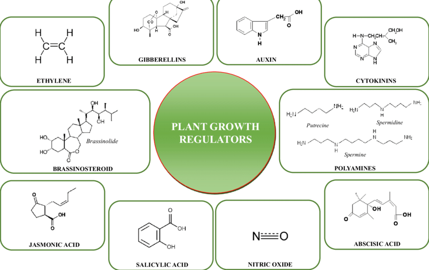 منظمات نمو وهي عوامل نمو داخلية موجودة في النباتات تنظم نمو النبات وتشمل مجموعة منها ,Auxins ، Gibberellins Cytokinins , Abscisic Acid والاثيلين الذي يعد اهم منظم لنمو النبات ، تخلق في اجزاء مختلفة من النبات وتسيطر على النمو واحداث التطور والتمايز ، وقد تتشارك بشكل تآزري او تضادي ، وتتاثر بالعوامل البيئية مثل الضوء والحرارة والتغذية والاوكسجين والجاذبية . وقد أوضحت العديد من الدراسات أن هذه المواد تحفز أنواع مختلفة من الخضر وتتخصص في الجزء النباتي الذي تحفزه .