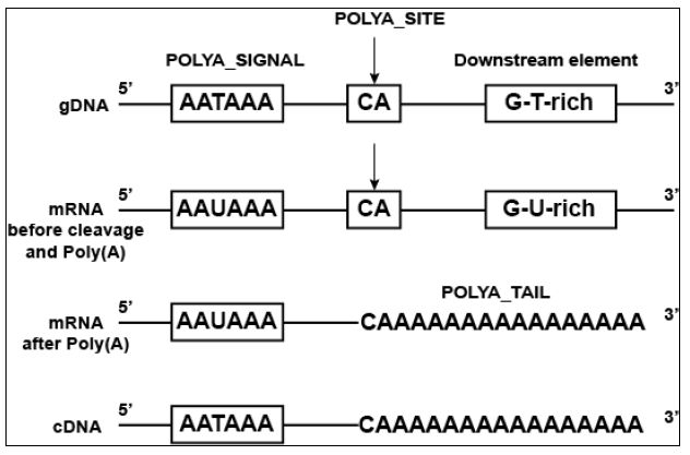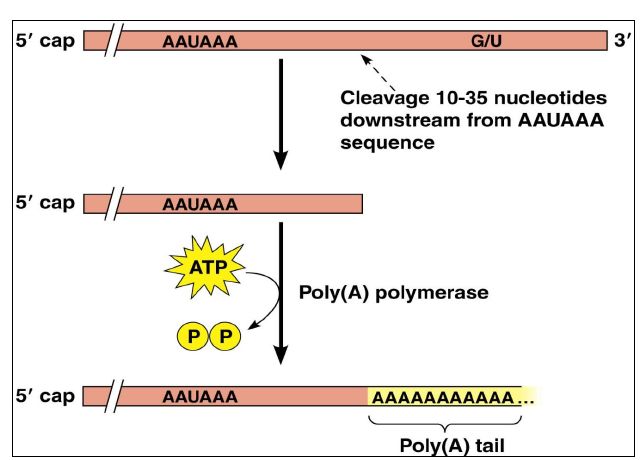 امتداد طويل من حوالي 10-250 قاعدة ادنين تضاف الى ذيل او النهاية ' 3 لجزيئة Per-mRNA بعملية Polyadenylation التي تتم بمساعدة EC 2.7.7.19) Polyadenylate Polymerase ) ، وتكون في الخلايا حقيقية النواة مهمة لانهاء الانتساخ وتصدير mRNA من النواة الى السايتوبلازم وكذلك مهمة في عملية الترجمة وتساهم في حماية mRNA من الانزيمات الهاضمة للحوامض النووية ، وتضاف قواعد الادنين عند الاشارة AAUAAA كما في الشكل :