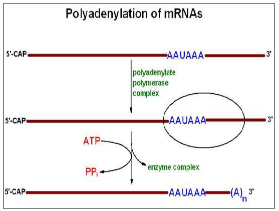 احد اهم التحويرات التي تتم على جزيئات RNA بعد انتساخها ونضجها اذ يضاف توالي من الادنين Poly A الى طرف الجزيئة ، احد اهم مهامه المحافظة على الجزيئات من الانزيمات القاطعة.