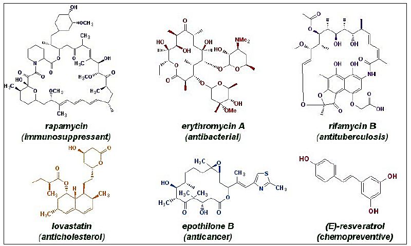 مجموعة من مواد الايض الثانوي مثل المضادات الحيوية التي تفرز من قبل البكتريا والفطريات و Streptomycetes وتتمثل بمجموعتين الأولى Macrolides و مثل الارثرومايسين Rapamycin والمجموعة الحلقية مثل التتراسايكلين.