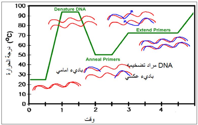 الثالثة : يتم استطالة القطع الأولية المضافة (Primers) وتتم بدرجة حرارة حوالي 75 م باستعمال DNA Polymerase (المستخلص من البكتريا المحبة للحرارة العالية Pyrococcus furiosus وThermococcus litoralis اوTaq المستخلص من Thermus aquaticus والملائمة لهذه المهمة، ويعمل الأنزيم بوجود خليط من النيوكلوتيدات الثايمين والسايتوزين والادنين والكوانين مؤدياً إلى تكون أشرطة مزدوجة جديدة من DNA التي تكون فيها القواعد متكاملة فيما بينها ويشمل العمل حدوث دورات للتخليق ( 25 -30) دورة مما يؤدي إلى تضخيم جزيئة DNA التي يمكن أن تستعمل فيما بعد لأغراض متعددة وأساسيات عمل الجهاز موضحة في الشكل الآتي :