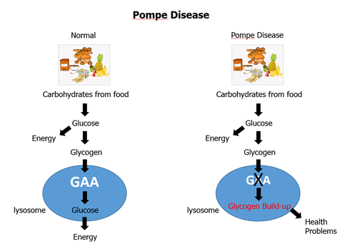 احد الامراض خزن الكلايكوجين النوع الثاني وهو مرض يورث بصفة جسمية متنحية يسمى (Acid Maltase Deficiency) ناتج من غياب الانزيم (α –1,4-Glucosidase , EC Maltase 3.2.1.3) الذي يكون طليعة لعدد من مواد الايض الاخرى .