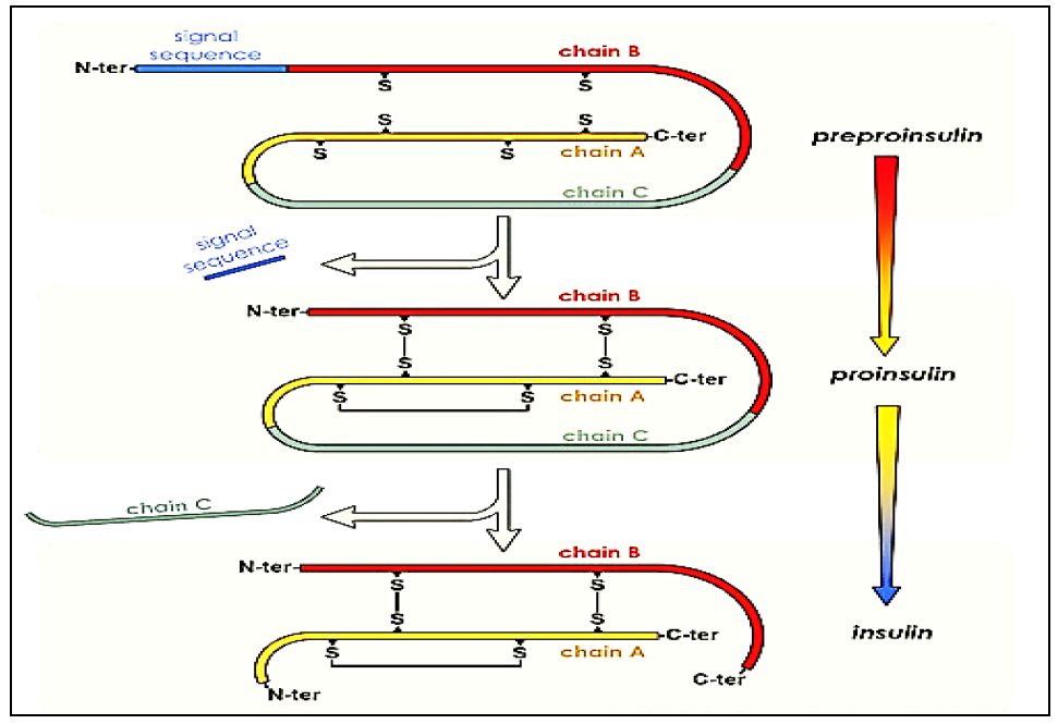 وبعد التخليق مباشرة تزال القطعة النهائية(Pre-) وتتكون ثلاث جسور كبريتيدية وتفيد القطعة (C) في وضع التفاف B ،A بشكل صحيح ثم ينقل Proinsulin إلى أجسام كولجي Golgi Apparatus لتقطع منه القطعة C ثم يعبأ ليفرز بدون إضافة السكريات أو أي تحويرات بعد الترجمة ويفرز كتوالي حاوية على 51 حامض أميني.