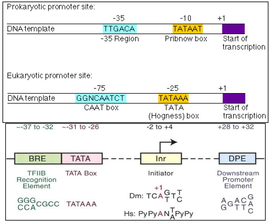 العناصر الذي يتكون منها الممهد ، وهي لب الممهد Core Promoter ويمثل الحد الادنى من تواليات الممهد اللازم لبدء الانتساخ وتشمل :