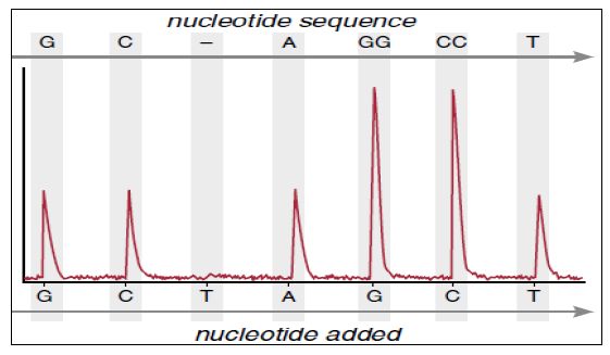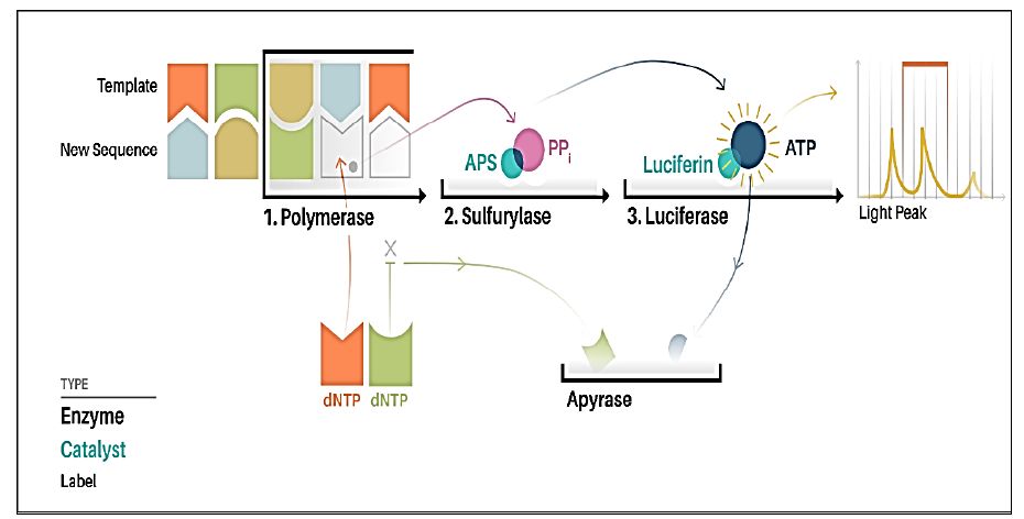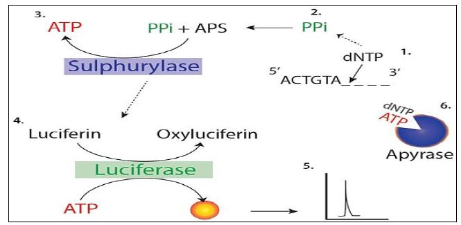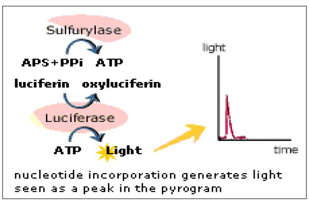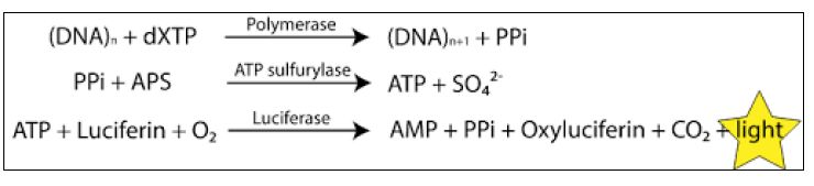ثم يضاف محلول يحوي على احد القواعد النتروجينية الاربعة ويسمح للتفاعل بالحدوث ، وعند ارتباط القاعدة النتروجينية مع ما يقابلها من القواعد في شريط DNA تنطلق (PPi( Pyrophosphate التي تكون ذات طاقة عالية لذا تستغل وتحول الى ATP بواسطة انزيم ATP Sulfurylase المشتق من خميرة الخبز ، وبمساعدة انزيم Luciferase ( المشتق من ذبابة النار Photinus pyralis يحول Luciferin الى Oxyluciferin مطلقا الضوء الذي يسجل بمجسات خاصة عند طول موجي 560 نانومتر وتكون شدة الضوء متناسبة مع عدد جزيئات ATP .