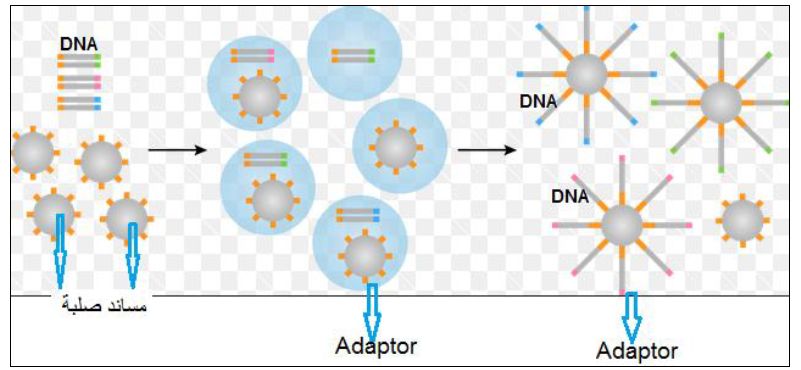يستعمل DNA Polymerase وخاصة Klenow Fragment من بكتريا Escherichia coli وانزيمات اخرى . في البداية يمسخ DNA المعني الى اشرطة مفردة ثم تضاف المكيفات Adaptors الى الاشرطة المفردة وتثبت على مساند خاصة :