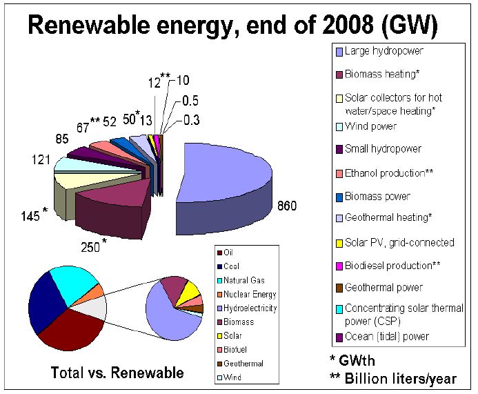 الطاقة التي تتجدد على مدى الزمن مثل ضوء الشمس والرياح والامطار والمد والجزر وحرارة باطن الارض ويمكن ان يستعمل بعضها من قبل الكائنات القادرة على التخليق الضوئي وبذلك فهي تحول الطاقة الشمسية إلى طاقة يمكن للإنسان استعمالها، فالنباتات تثبت سنوياً ما يقارب من 2*1110 طن من الكاربون باستعمال مقدار من الطاقة الذي يصل إلى 22*2110 جول ، وبذلك تكون كفاءة الأحياء الخضر في اقتناص نسبة 3– 4% من الطاقة الواصلة للأرض التي تستعمل لانتاج الطاقة وانتاج الوقود الحيوي Biofuel مثل Bioethanol وغيرها من انواع الوقود الحيوي ، وتستعمل لاغراض مختلفة مثل توليد الطاقة للتسخين او النقل وغيرها من الاغراض ، وكل مصدر من المصادر يشكل جزءا" من الكل . وتعد هذه الطاقة هي الأهم مقارنة بالطاقة الحفرية غير المتجددة مثل النفط الذي سينفد يوما ما. ويمكن استعمال الطاقة الشمسية لإنتاج النفط كما في بعض النباتات أو الطحالب.
