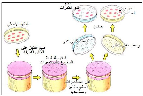 طريقة صممها Lederberg and Lederberg عام 1952 وبواسطتها يمكن عزل الطفرات من مجموع بكتريا نامية تحت ظروف غير انتخابية وتستعمل بشكل أساسي في وراثة البكتريا، وفيها ينمى المزروع البكتيري المعامل بالمطفرات على وسط صلبغير انتخابي بحرارة ملائمة إلى ان تصل المستعمرات حجم متوسط ثم تطبع هذه المستعمرات على Replica Block المكونة من اسطوانة صلدة قطرها أقل بقليل من قطر الطبق مغطاة بقماش القطيفة Velvet ومثبتة بحلقة معدنية ، وبعد طبع المستعمرات عليها تطبع عليها أطباق حاوية على عوامل انتخابية مثل عوامل نمو أو مضادات حيوية ويمكن طبع أطباق عديدة تصل إلى 15 طبق بكفاءة عالية ثم تحضن الأطباق المطبوعة في الحاضنة بدرجة حرارة ملائمة، أما الطبق الأصلي الذي طبعت منه الأطباقMaster Plate فيحفظ لمقارنة الأطباق الأخرى كما موضحة في الاتي :