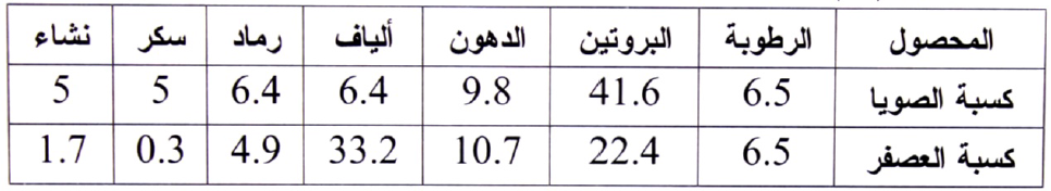 جدول يبين مقارنة مكونات كسبة فول الصويا وكسبة العصفر بالنسبة المئوية