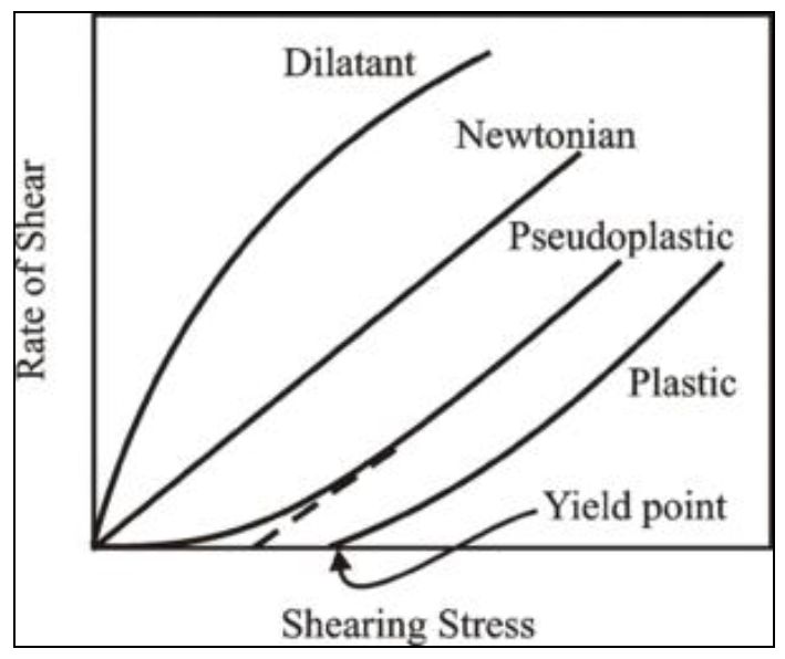 مخططات ترسم لإيضاح تصرف السوائل المختلفة لتحديد التغير في اللزوجة ومرونة المواد وهي تختلف في السوائل النيوتينية عن غيرها ويوضح الشكل التالي تصرف أنواع السوائل عند زيادة معدل القص أو الخلط وما يحدثه من تأثير في الأوساط.