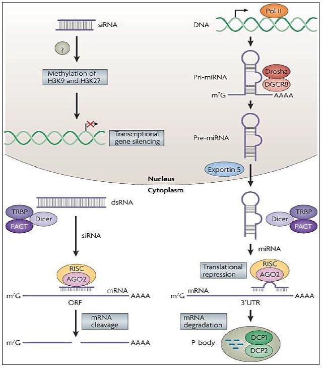 نظام تداخل لعمليات التنظيم مشابه لما يسمى في النباتات ب Post Transcriptional Gene Silencing يعتمد على جزيئات RNA ومنها miRNA التي تخلق كنسخ أولية Pre-miRNA مكونة من حوالي 70 نيوكلوتيد بشكل تركيب يشبه ماشة الشعر يتم فلقها بواسطة RNA III Exonucleases الموجود في الأحياء الراقية الذي يوجد منه نوعان Drosha المتخصص بفلق النسخ الطويلة مثل Stem-Loop الموجودة في النسخالأولية للmiRNA الحاوية تراكيب مزدوجة ، تصدر من النواة بواسطة المصدرات Exportins من النواة ثم تعالج بواسطة RNase III المسمى Dicer الذي يميز المناطق المزدوجة في الجزيئات الأولية ويقطع الشريطين وبذا يزال تركيب ماشة الشعر المزدوج لتكون النتيجة النهائية قطع 20- 22 نيوكلوتيد ترتبط الى أحد بروتينات Argonaut مكونة المعقد ألبروتيني RISC) RNA-Induced Silencing Complex ) اما الباقي من الجزيئة فيفكك. ويقوم المعقد الأخير بمسح جزيئات mRNA للبحث عن ما يكمله من القواعد النتروجينية والقواعد التي يبحث عنها المعقد وmiRNA والموجودة في 3UTRs لل mRNA تشمل مكررات من 7 - 8 من التواليات ، وهناك مناطق أخرى مكونة من 6 قواعد يمكن ان تشارك في الارتباط ، والذي لا يشترط فيها التكامل التام ولكن عندما يكون هناك عدم تكامل تام في النهاية ' 5 تحتاج العملية الى تكامل تام على الطرف الثاني ' 3 وتساهم الطاقة الحرة في ثبوت المزدوجات المكونة من miRNA : mRNA ،ويرتبط المعقد بها ويبدأ بتفكيكها نتيجة الفعاليات الإنزيمية له المتمثلة ببعض بروتينات AGO) Argonaut) وبمساعدة ايونات المغنيسيوم وقد يكون ذلك بفلق ذيل الأدنين . وجزيئات miRNA المحملة في المعقد RISC تحور التعبير الجيني بتخفيض معدل الترجمة وذلك اما بفلق جزيئات mRNA او تثبيط الترجمة. والحالة الأولى (الفلق) تحتاج الى التطابق التام اما عند عدم حصول الأخير فتعمل الآلية الثانية وهي كبح الترجمة والتي تمارس فعالياتها اما بإحباط عملية بدء الترجمة او إحباط عملية الاستطالة للببتيدات ولو انه في الآونة الأخيرة أمكن إثبات ان miRNA يمكن ان تساعد في ترجمة بعض mRNA المستهدفة . ومن الجدير بالذكر ان جزيئة miRNA واحدة يمكن ان تستهدف مئات من جزيئات mRNA اي تكون شبكة معقدة من التنظيم ولكن هناك ارتباط وثيق بين هذه الشبكات التي تؤثر فيها الجزيئة الواحدة . وجزئيات miRNA تعد من العوامل الفاعلة في إحباط عمليات الترجمة ولها دور في تنظيم عملية التطور والتمايز المرتبطة بتوقيت التمايز وبقاء بعض الخلايا دون تمايز اي إبقاء البعض كخلايا جذعية ، وفي الإنسان وبعض الأحياء الأخرى تكون miRNA لها دور في تكوين بعض الأورام واضطراب دورة الخلية وفي هذه الحالة يمكن ان تشارك في فعالية جينات السرطان او المخمدة للسرطان ، كما انها يمكن ان تشارك في مثيلة او إزالة المثيل من الهستونات. ومجمل العمليات موضحة في الشكل :