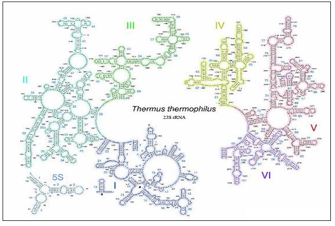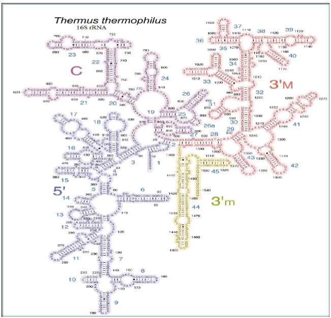 والمنطقة الخاصة ب 16S rRNAاستعملت في التصنيف وكذلك إيجاد المسافات في العلاقات التطورية للأحياء Long-Distance Evolutionary Relationships ، وتبين من الدراسات ان الاختلاف الرئيس بين البكتريا الحقيقية والاركيا يعود الى الاختلاف فيrRNA ( فضلا عن الاختلافات في تفاصيل عمليات ومكائن التضاعف والانتساخ) ، ووفقا للقاعدة التي تشير الى ان الاختلاف بنسبة 5 % تكون كافية لاعتبار الكائنين أنواعا مختلفة ولكن مع الأخذ بنظر الاعتبار ان جزيئات 16S rRNA هي ليست دائما ثابتة تماما ضمن الأنواع خاصة وان انتقال هذه الجينات يمكن ان يتم أفقيا والذي يؤدي الى إضعاف قوة 16S rRNA كمؤشر تصنيفي وعليه فان وضع تواليات 16S rRNA كحجر أساس لعمليات التصنيف لا تزال محض اختلاف. ومع هذا فان استخدام الجزيئات الأخيرة لإغراض مختلفة مثل التصنيف يفضي الى إعطاء معلومات ذات معنى حول الكائن الحي بذاته ،في حين ان استعمالها لإيجاد العلاقات التطورية تهدف الى وصف العلاقات التطورية بين الجينات او الكائنات وذلك يوضح ان التصنيف والعلاقات التطورية يخدمان هدفين مختلفة الأغراض وان أساساتهما ليست دائما متداخلة ، والاشكال التالية توضح بعض تراكيب هذه الجزيئات المهمة :