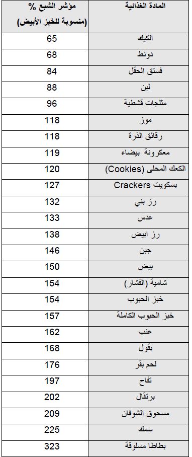 والعلاقة العامة التي وضعت ان الأغذية ذات مؤشر الشبع العالي تتصف بنسبة عالية بين وزنها : محتواها من السعرات ، اذ تساعد على مليء المعدة ويمكن ان يحل مؤشر الشبع محل مؤشر سكر الدم في تحديد النمط الغذائي خاصة لذوي الاحتياجات الخاصة . والجدول التالي يوضح بعض قيم مؤشرات الشبع لبعض الأغذية التي تم دراستها .