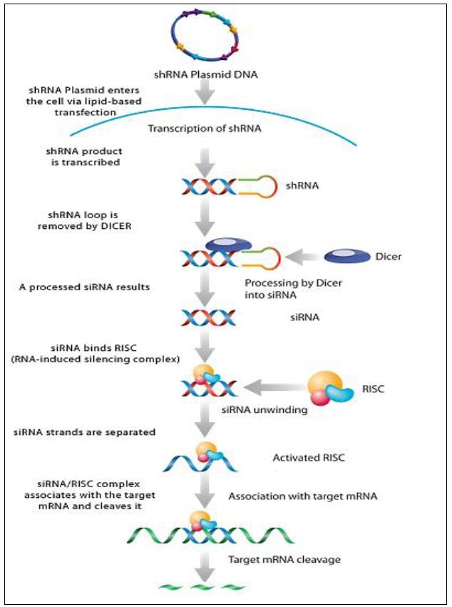 جزيئات قصيرة من RNA صناعية Short Hairpin RNA ويكون احد طرفيها تركيب ماشة الشعر ، تنتج على نطاق تجاري للأغراض العلاجية ، والمشكلة انه ليست كل الخلايا يمكن ان تتقبل هذه الجزيئات بمعدلات عالية والمحاولات جارية من قبل بعض الشركات لإنتاج جزيئات ذات صلاحية طويلة وكفاءة أعلى. تدخل الى الخلايا بواسطة النواقل البلازميدية او الفيروسات لتكمل طريقها في التداخل مع RNA .