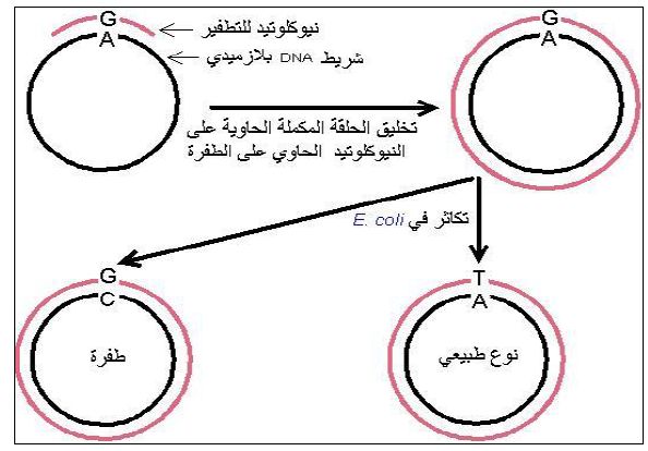 ويتم تحضير النيوكلوتيدات بالتوالي المطلوب الذي يحوي على الطفرة وتهجينها مع عاثيات مفردة الاشرطة من DNA ذات تواليات طبيعية ، كما موضح في الشكل الاتي :