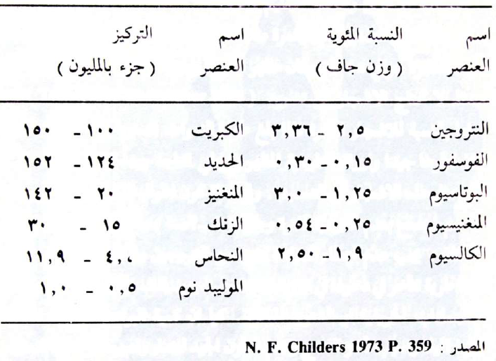 جدول يبين تراكيز العناصر الغذائية في اوراق الخوخ المأخوذة من اشجار قياسية.