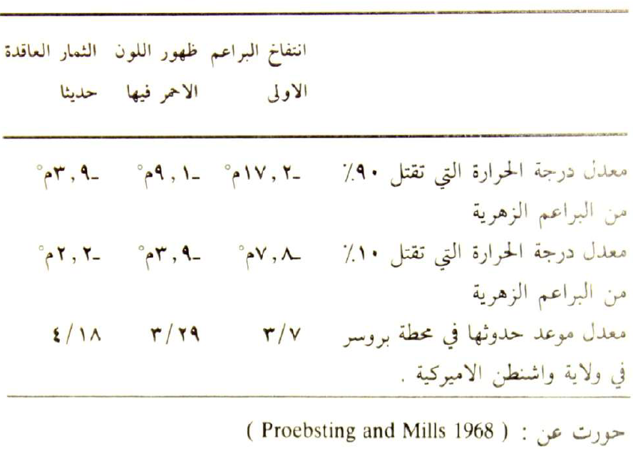 جدول يبين درجات الحرارة الحرجة لبراعم وازهار خوخ البرتا.