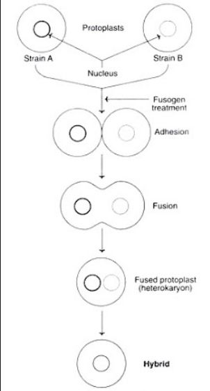 دمج الخلايا الجسمية باستعمال البروتوبلاستات بدلاً من الخلايا الحاوية على الجدران الخلوية، وتكون مشتقة من أحياء بعيدة عن بعضها لتنتج خلايا تحوي على صفات وراثية وسايتوبلازمية للخلايا التي تم دمجها .