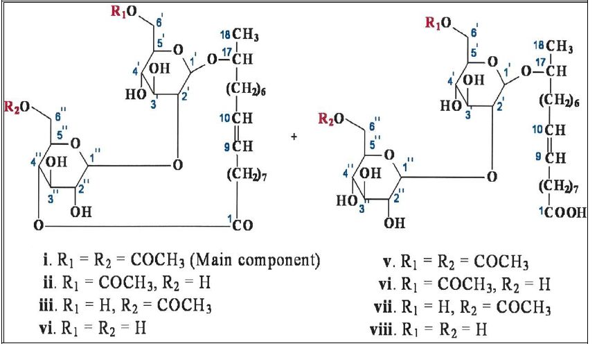 تتكون المشتتات من 16- 18 من الحوامض الدهنية كذيل كاره للماء ورأس كربوهيدراتي محب للماءالذي هو سكرثنائي للكلوكوز ولكن مرتبط باصرة غير طبيعية β- 1,2 ويمكن ان تضاف له مجموعة استيل على الموقع 6" , ' 6 له قابلية مثبطة للاحياء ، ينتج من الخميرة المحبة للتنافذ العالي Osmophilic مثل Candida bombicola ويتكون من -O-β-D-glucopyranosyl -β-D-glucopyranosyl المرتبط β-glycosidically الى سلسلة من الحوامض الدهنية الطويلة (16-18) ذرة من الكاربون فيها واحد او اكثر من الاواصر المزدوجة ( أي عدم التشبع) . ويعد من المشتتات المهمة لاسباب عدة فهو يعمل بمدى واسع من الارقام الهيدروجينية والحرارة والملوحة ، قليل السمية ويتحلل حيويا ومقبول من النواحي البيئية ولا يكون رغوة كبيرة وله قابلية تنظيف Detergency عالية التي تشجع استعماله في مجالات مختلفة ويمكن انتاجه بالتخمر من مصادر متجددة او الفضلات الصناعية وسهل الاستخلاص .