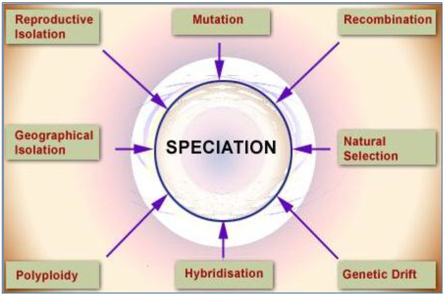 عملية تطورية ينتج عنها تكوين انواع جديدة ومميزة ، ويحدث فيها انشطار مجموعة من الاحياء Lineage لاعطاء اثنين او اكثر من الانواع . تتاثر العملية بعدد من العوامل منها العوامل الجغرافية والفسلجية والتشريحية التي تؤدي الى منع التزاوج Interbreeding بين الانواع الجديدة الناشئة نتيجة العزل الجغرافي بشكل رئيس وتصبح الانواع الجديدة مستقلة وراثيا ، وتعتمد العملية على الانتخاب الطبيعي . في هذه الحالة يحصل تغيير في المكونات الوراثية للمجموع عند انتقالها من جيل الى اخر