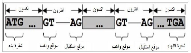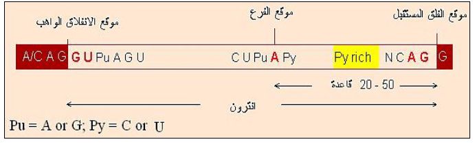 وعلى العموم فان وجود هذه التواليات(GT ….. AG) في قطعة ما لا يعني وجود الانترونات ولكن هناك توالي يحوي على ما يسمى موقع الفرع Branch Site الذي يقع على بعد 20- 50 قاعدة الى يسار مستلم الانفلاق وتوالي الموقع في RNA هو(CU(R/C) A (C/U) حيث تكون A ثابتة في كل الجينات كما موضح في الشكل :