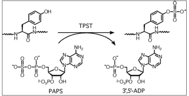 اضافة الكبريت كما في اضافتها الى الحامض الاميني التايروسين التي تعد احد التحويرات التي تحصل بعد اكتمال عملية الترجمة للبروتينات في تفاعل يسمى كبرتة التايروسين وتفاعلات اضافة الكبريتات يتم بواسطة EC 2.8.2.20)(TPST)Tyrosylprotein Sulfotransferase) الموجود في اجسام كولجي ، ويضيف الكبريتات من معطياتها العامة في الخلية الى هيدروكسيل ثمالة التايروسين .